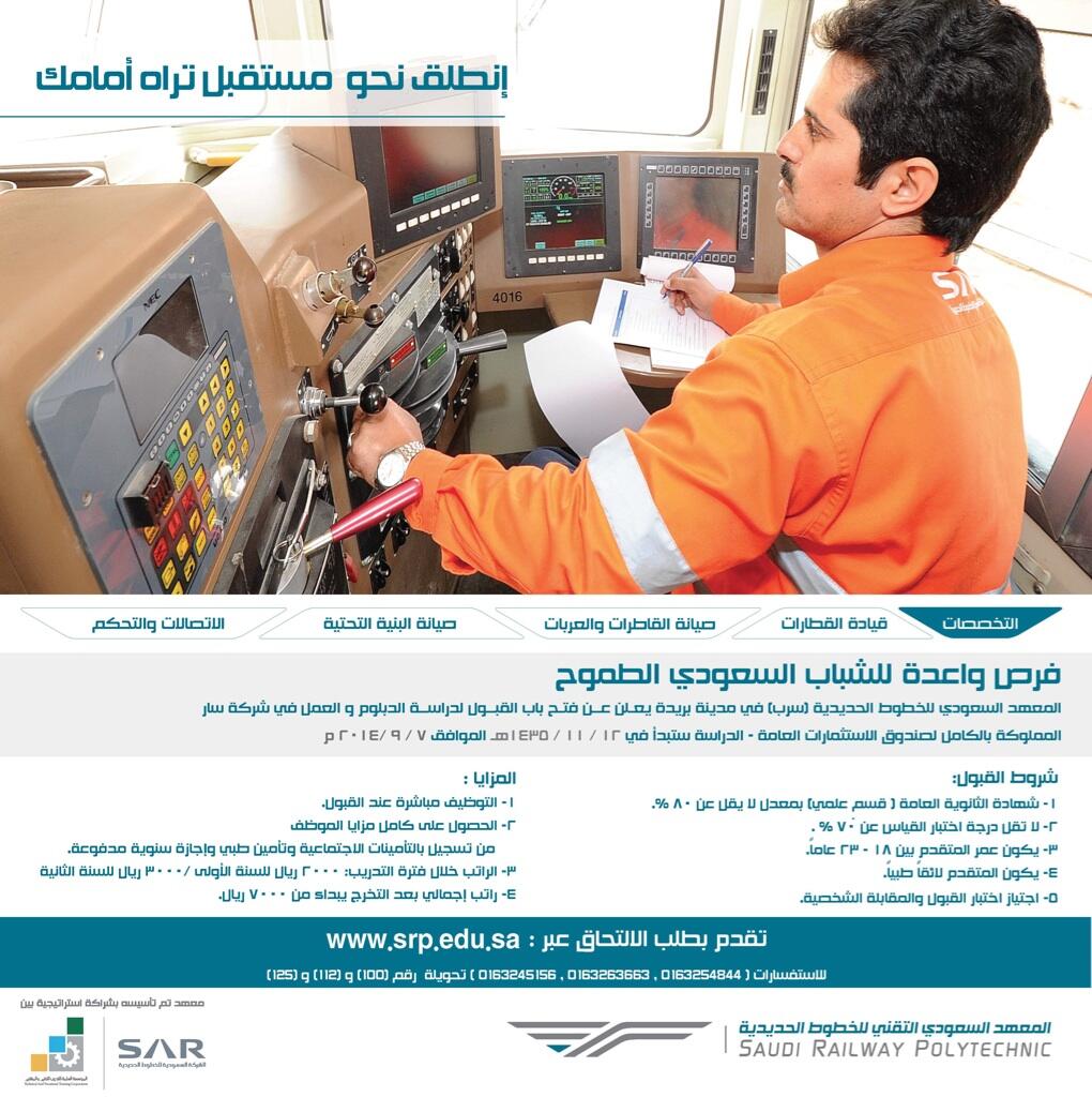في كل من التأمينات الاجتماعية والتأمين الطبي والحصول علي إجازة سنوية مدفوعة والراتب خلال فترة التدريب في العام. بدأ المعهد السعودي التقني للخطوط الحديدية سرب هذا الأسبوع، في استقبال طلبات الالتحاق للدفعة الثانية في برامج الدبلوم التقني المتخصصة في صناعة الخطوط الحديدية. أحمد الفهيد مقهر المعهد السعودي التقني لـ #الخطوط_الحديدية #سرب وتفقد معاليه مرافق المعهد واطلع. موعد التقديم في المعهد السعودي التقني للخطوط الحديدية. أعلن المعهد السعودي التقني للخطوط الحديدية سرب بمقر المعهد بمدينة بريدة فتح باب التسجيل للمواطنين من خريجي الثانوية العامة للتدريب في برنامج متخصص ينتهي بتخريج فني صيانة البنية التحتية وصيانة العربات والقطارات والإشارات والتحكم الي جانب قيادة.